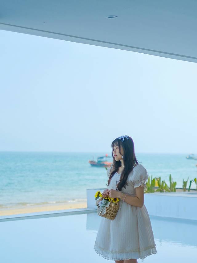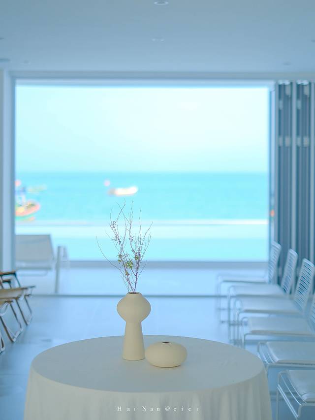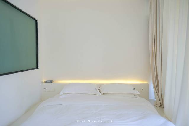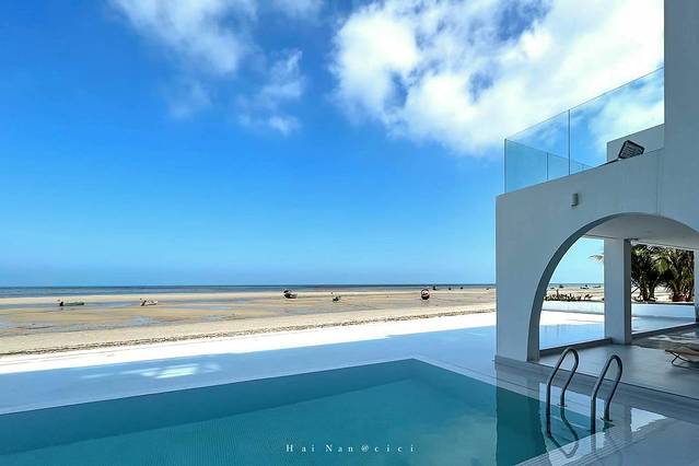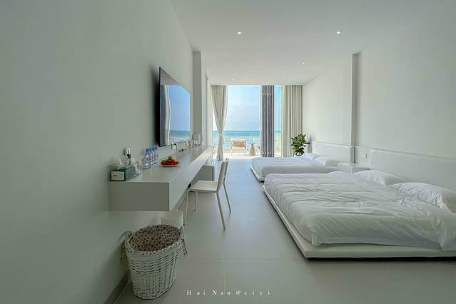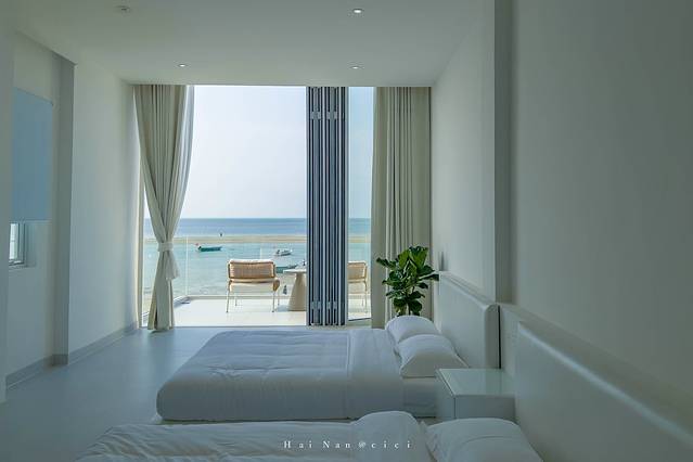 民宿位于临高东英镇博纵村,是一整栋纯白色的建筑,就在海滩边上,像一座藏在临高的“圣托里尼”。民宿的房间,推开窗就是无敌的蔚蓝海景,海风习习温柔吹进房间里,荡起洁白的窗帘。
