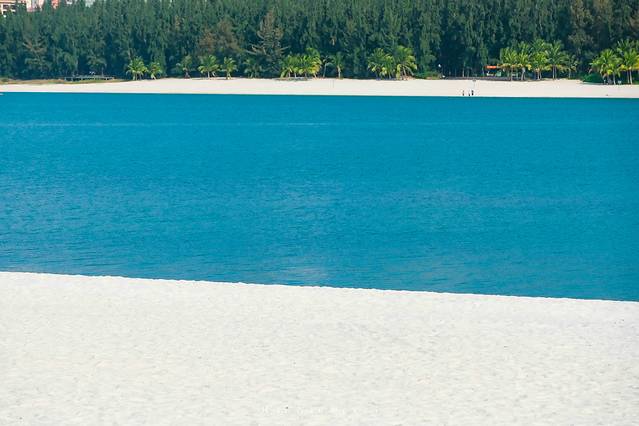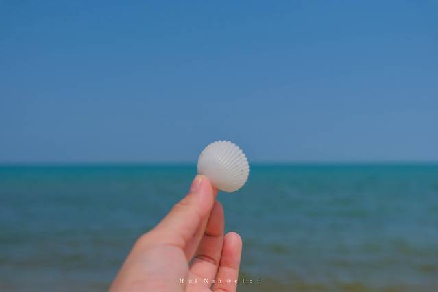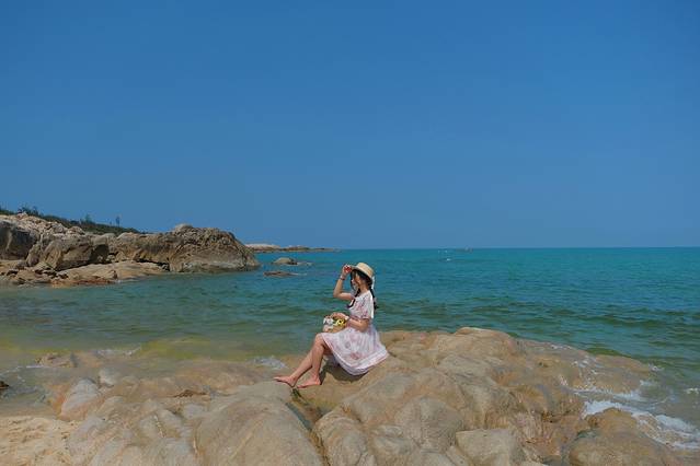 棋子湾的海水清见底,沙细质软,洁白如银,闪闪发亮。