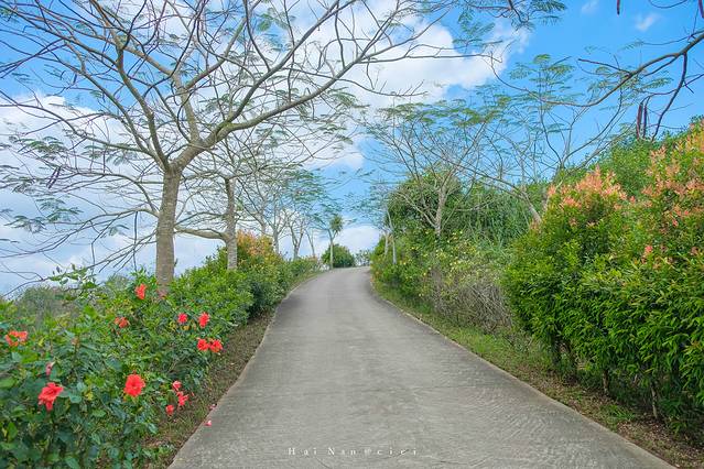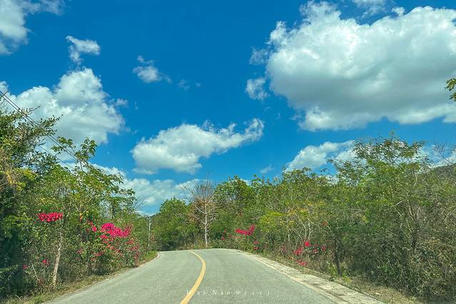 弯弯绕绕的山间公路,道路两边都开满了艳丽的三角梅,还有热带灌木丛,还有名贵的黄花梨树,要知道东方的黄花梨木可是闻名海外。