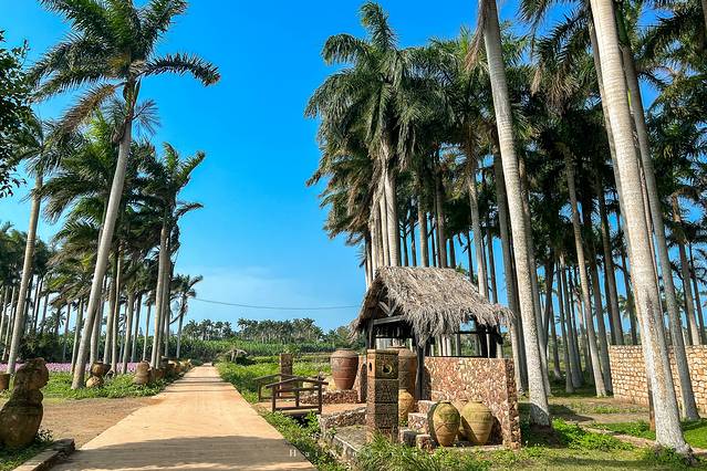 园区内遍布各种热带植物,有大片的霸王棕和椰子树汇聚成林,构成一道风光秀丽的景象。园区分为上院、下院、南院、北院以及别院五大区域,柴窑和陶工坊位于园区的下院 。掩映在郁郁葱葱的林木之中五孔仓式窑,在宽大窑棚的阴影中显得古朴而神秘,窑棚一旁青砖灰瓦陶工坊内部面积多达上千平米,显得宽敞而明亮。