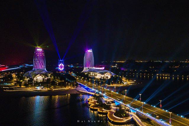 夜晚里,坐在岸边的草坪上,便能看一场海花岛五光十色的动感灯光秀。