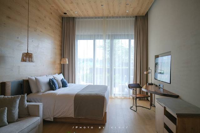 民宿的客房设计也温馨简洁,是满满的ins简约风格,纯白搭配木质的温暖色调,房间宽大舒适,大都带有阳台。