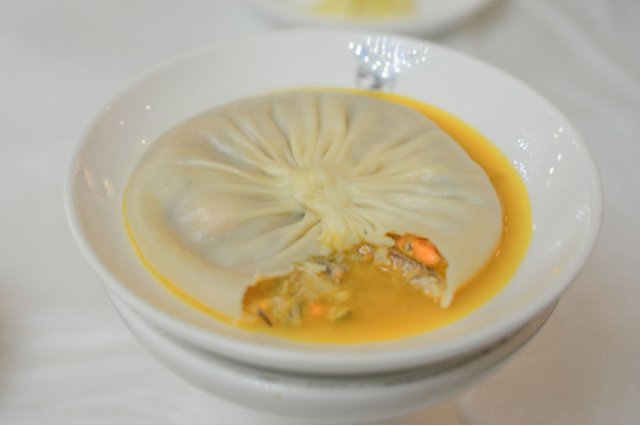 蟹黄汤包吃法比较讲究:轻轻提,慢慢移,先开窗,后喝汤,最后一扫光。在汤包上开一个小口,然后小口小口的去吸那个汤汁,鲜到昏迷,好吃得身上的每个毛孔都开始叫嚣,怎一个鲜字了得!最后打开汤包,带着螃蟹鲜味的肉汤一下子浸满口腔,满满的蟹黄森林,大口大口的超满足,简直就是螃蟹发烧友心中的美味佳肴。吸完汤汁,加点香醋,配上姜丝,大口咀嚼,真是心神荡漾。