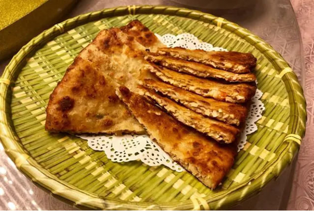 外国人把馅料放在面皮上,做成了比萨;靖江人把馅料包起来,做成了大烧饼。靖江人把馅心包在面皮里,揿平,揿薄,揿圆,所以在有的乡镇又叫“揿烧饼”。南园宾馆的靖江大烧饼用土灶大锅,烧得烟冒冒,油从四周均匀洒下,把面饼煎得两面微黄,香气四溢。乘热铲出,立即切成八个均等的小扇面,趁热吃才妙。