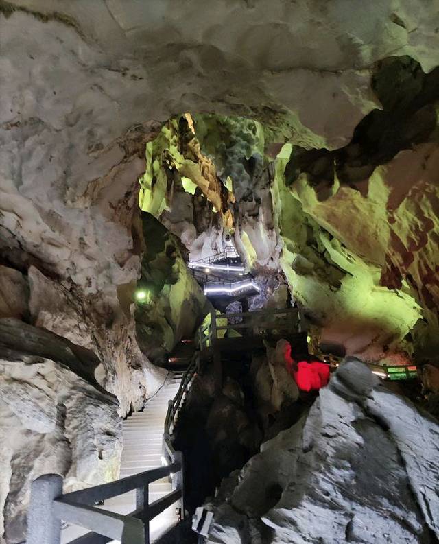查阅了一下灵岩洞主要是看里面的灯光,整个景区不大包含两个洞 莲花洞和涵虚洞 整个溶洞就在山里 爬到半山腰往下走 里面命名的点不多 特殊之处在于这是一个内部高度非常之高的溶洞 里面至少有几层楼高这个洞是可以乘船出去的。最后的那段坐船出洞挺不错的,这段路挺长的,坐在船上抬头看着岩石,感觉还蛮不错的,最后这段简直是神来之笔啊。
