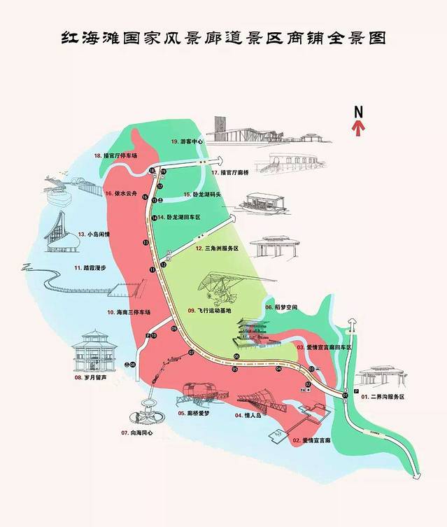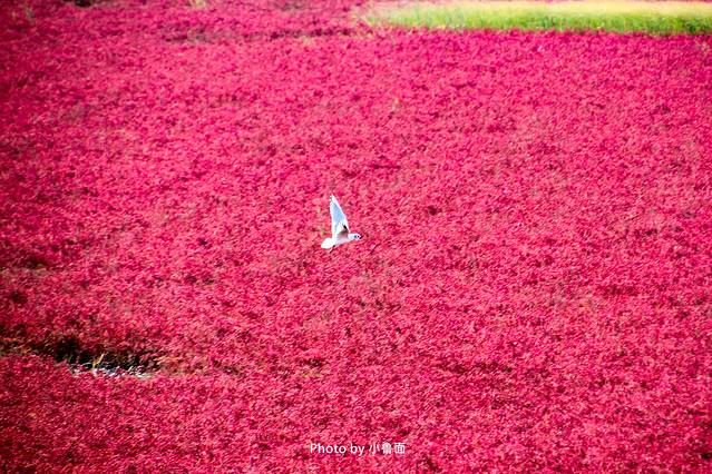 红色的部分就是碱蓬草的范围、绿色的则是芦苇,红绿交错的湿地上生活着已黑嘴鸥为主的鸟儿们,与远处搭建的木制结构观赏亭相互映衬,组成红海滩上一幅美丽景象。