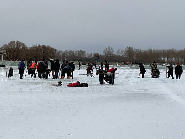 已经有人在收购冰汤圆,工人们在切割。冰层还有八十公分厚。