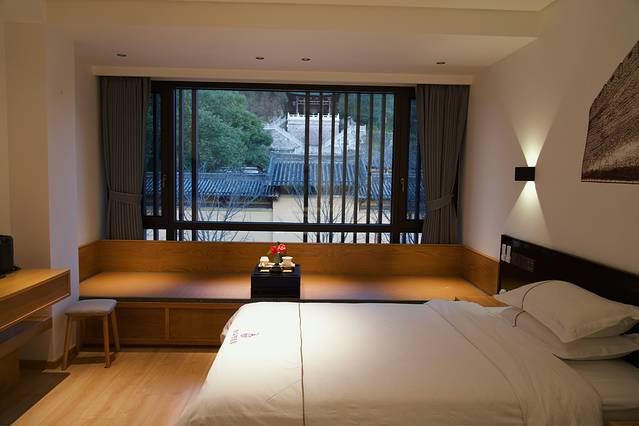 民宿的整体装修,融合了古典与现代,显得十分雅致。一楼大堂还设有吧台,可以点一杯咖啡或水果茶,悠闲地坐一下午。二楼沿街的客房是我的最爱,窗外就是千佛塔 和龙 兴寺。主打智能客房,可以AI声控开关空调等。设施齐全、床品舒适。