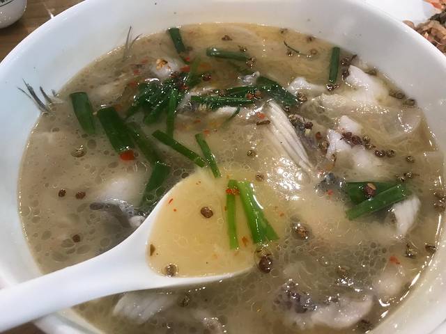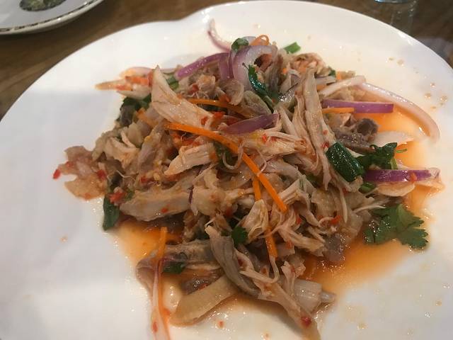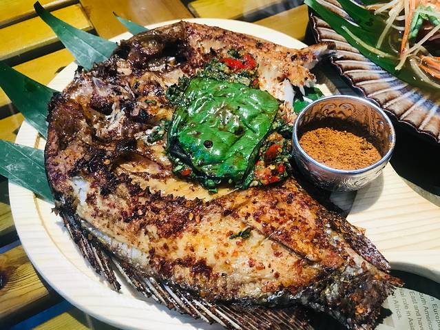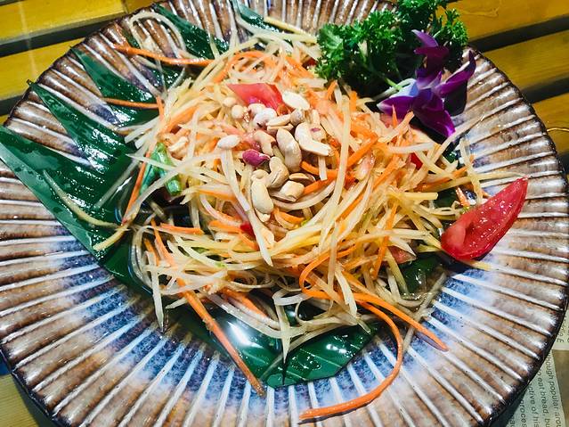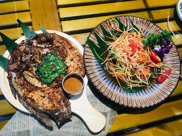 这个凉拌木瓜丝就不推荐了,感觉不是很新鲜的样子,木瓜丝一点都不爽口。这个香茅草烤鱼一定要点,鱼肉很嫩也没有什么刺,关键是那个绿叶子里包的调料,也不知道是什么,真的好好吃,鱼肉一定要和那个调料一起吃,太香了。