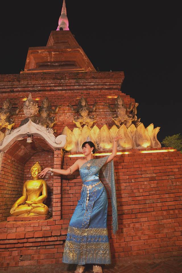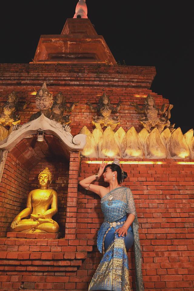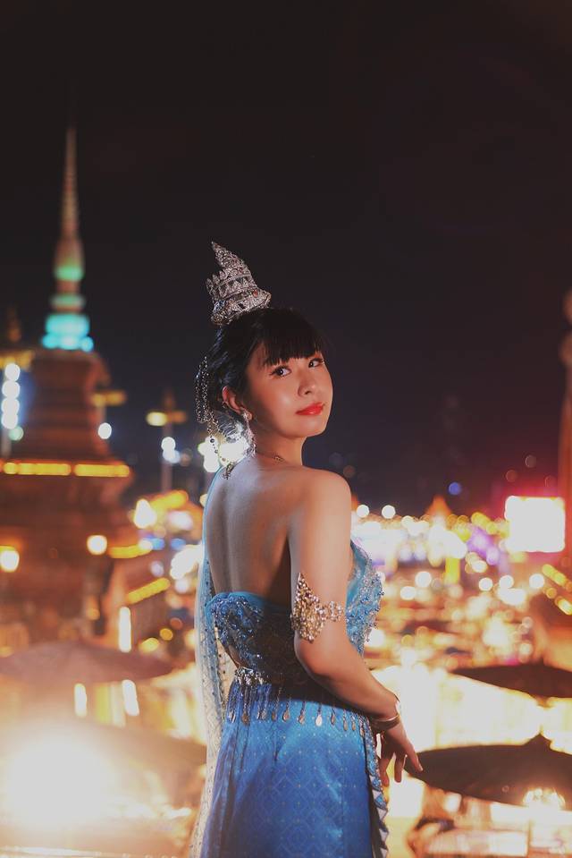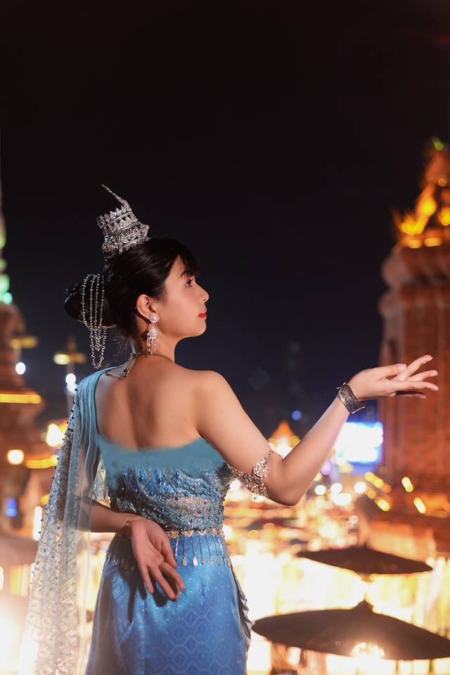 本来买了一套傣装,想穿自己的衣服拍,但是到了之后老板说,我的衣服没有钻太素了,他们的衣服拍出来更好看,看了一眼我的脸,给我挑了一件蓝色的。说实话,一开始我特别嫌弃这个衣服,实物比照片饱和度要高,感觉特别俗气,中间几次想换了它,哈哈哈。