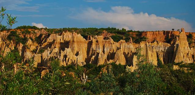 云南因有了昆明石林,所以较少人知道楚雄(元谋)土林,我决定去那儿是因为在网上看到了它的照片,非常震撼!色彩丰富,造型奇特。以前在陕西张掖见到过还没被完全开发的丹霞地貌,象巧克力蛋糕一样一层一个颜色,非常漂亮,已够人兴奋的了。而土林在丹霞地貌基础上又加上了各种造型,有的高耸入云,巍峨挺立,有的象宫殿,更象城堡,色彩加造型组成了极少见的奇观,足可与石林争妍斗奇,而我认为土林更姘更奇。
