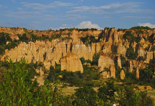 元谋有浪巴铺、物茂和班果3个土林,其中浪巴铺最大,在元谋县城西33公里,还未被开发,所以很少游人来。土林由沙粒、粘土和石英砾组成,其中还有丰富的动植物化石。它们是距今两百万年前早第四纪积淀下来的,砂子和粘土中含有少量钙质胶结物,间或夹杂一些铁质结合体。由于这些土壤在漫长的岁月中,不断吸水、膨胀;失水、收缩,致使地面龟裂;加之雨水延裂缝冲刷、流动,久而久之,裂缝逐渐加深、扩宽、延长,土柱逐渐显露、增高,因而形成土林。土柱身上杂有的石英、玛瑙等,显露出来后,在太阳的照射下,放出奇异的光彩,加上它独特的造型,真是令人叹为观止。