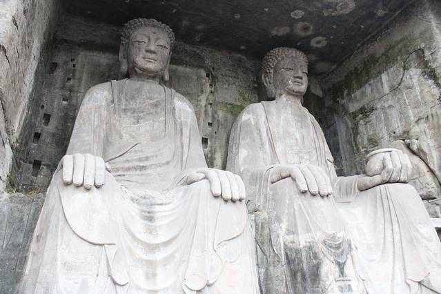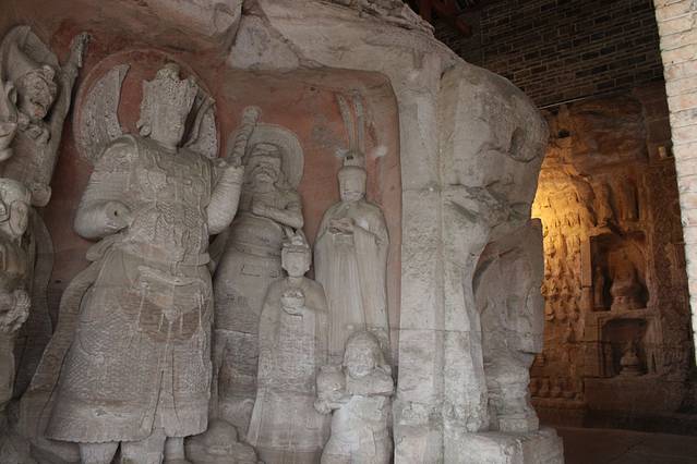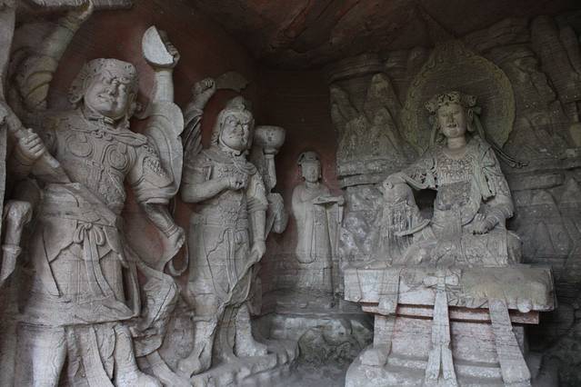 大足石刻位于重庆市大足区境内,是唐、五代、宋时所凿造,明、清两代亦续有开凿。现为世界文化遗产,世界八大石窟之一。