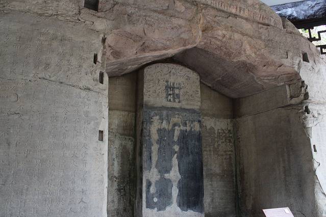 赵懿简公神道碑 中间那个黑色的碑就是传说的蔡京碑(赵懿简公神道碑),位于103号窟内壁正中,就是墓碑,里面内容介绍北宋重臣赵瞻,谥号“懿简”他的生平事迹,北宋大臣范祖禹撰写碑文,宰相蔡京手书。因为其字笔力遒劲,意气风发,古人称此碑为“蔡京碑”,因为蔡京手书的碑刻存世稀有,是我国传统书法艺术珍品。蔡京为四大书法家(宋四家:苏轼、黄庭坚、米芾和蔡京)之一。墓碑为什么是黑色的,因为是蔡京的书法,古人常拓字售卖,拓字用墨水浸染,为了所拓之字变成孤本,每拓一次就毁坏一部分碑文,致使此碑字迹残缺甚多,实为千古憾事。