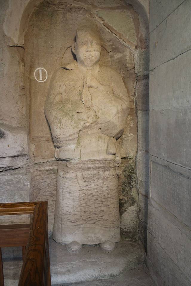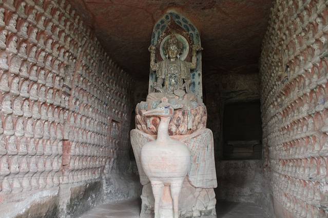 毗沙门天王龛 此龛是韦君靖据《毗沙门天王经》镌造,通编为第5号。建于唐(景福元年),韦君靖造此像有自我比附为唐之毗沙门王之意,毗沙门天王又名北方多闻天王,是佛教护持北方的护法神。