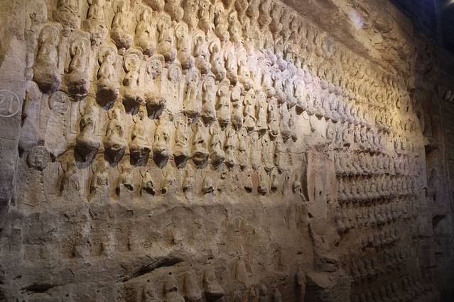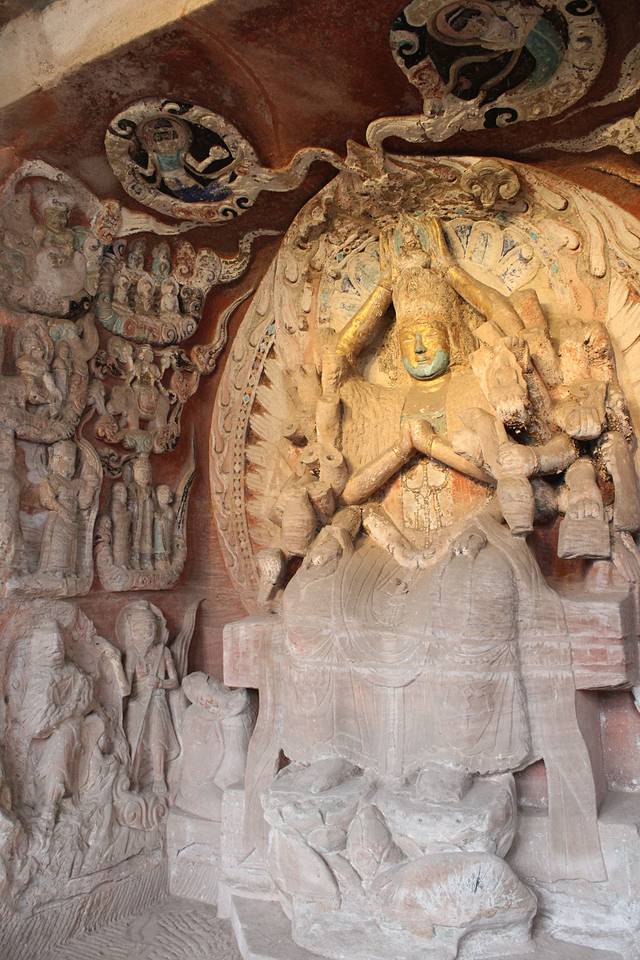 千手观音龛 手观音是国内唯一真正的千手观音,约1006个。此龛千手观音刻于唐末,编为第9号。人们仰观音,视观音为“美神”,因此,北山佛湾有“美神荟萃的艺术宫殿”之说。观世音,是楚文的意译,也译做“观自在”“光世音”,“观世自在”等。