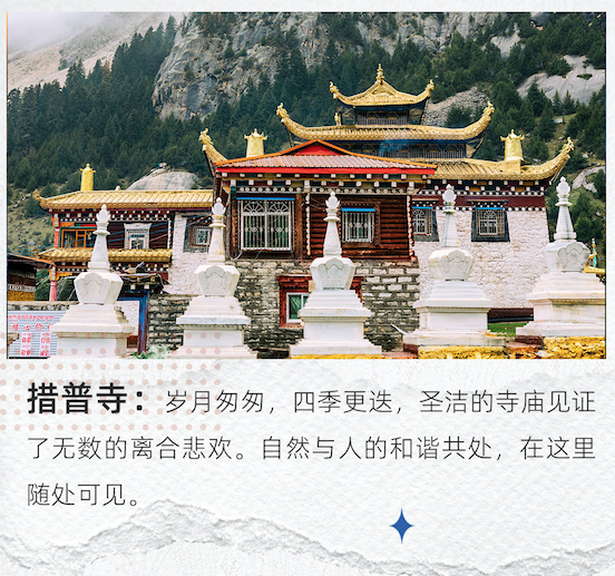 号称“国道318醉美遇见”的措普沟,的确担得上这个美名,草原、神山、湖泊、寺庙,这些元素一笔一画勾勒出静谧而温柔的画卷。