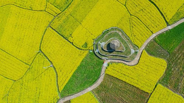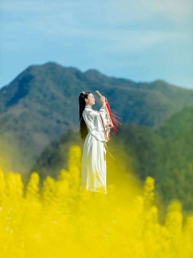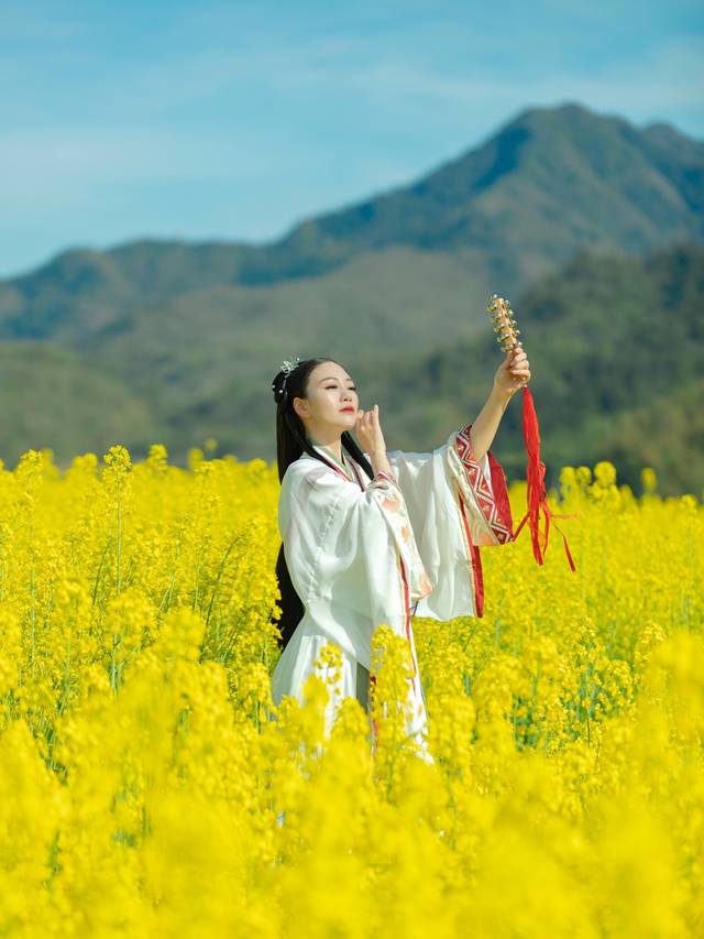 自驾前往蕉川村,导航就可以到达,非常方便。这里的油菜花田很大,航拍能看到全景,相当壮观。花海也很适合拍汉服,因此我特意带了一身素色的汉服。