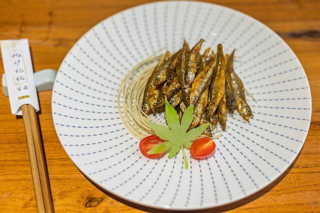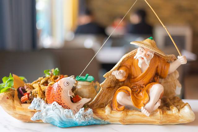 炸小溪鱼的摆盘相当有特色,就是一个渔夫在钓鱼,真的很形象了。尝了一下,很喜欢这个小鱼,香脆可口。