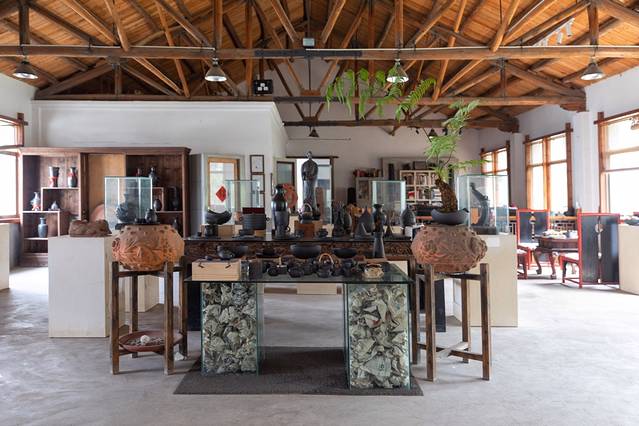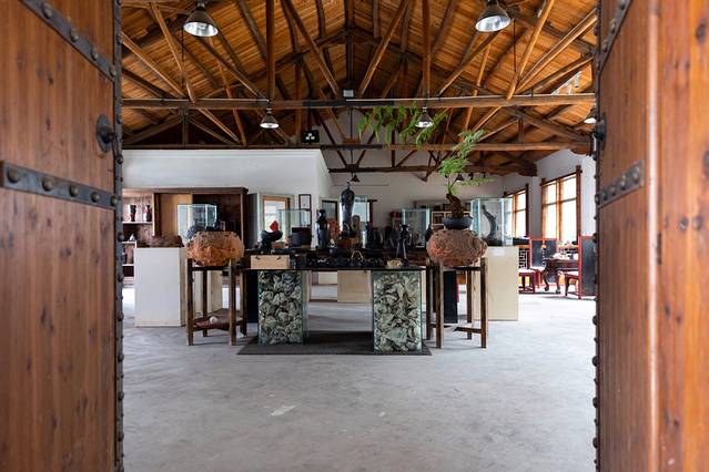 汤老师的工作室在 遂昌 三墩文化村,一楼是作坊,二楼是会客厅和展厅。初见他,一头长发,一身布衣,为人洒脱,一看就是艺术家。