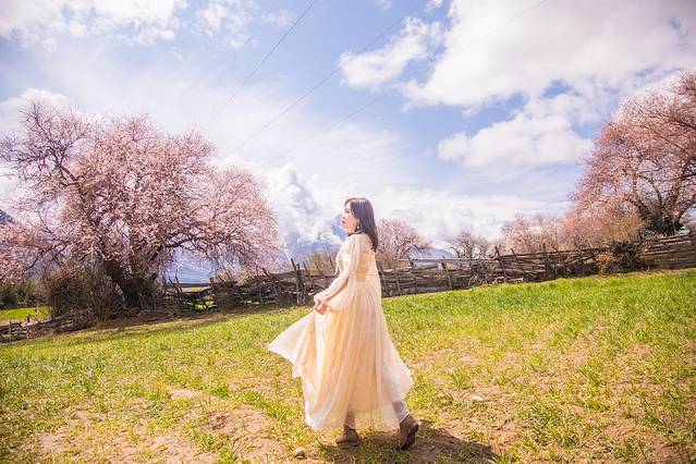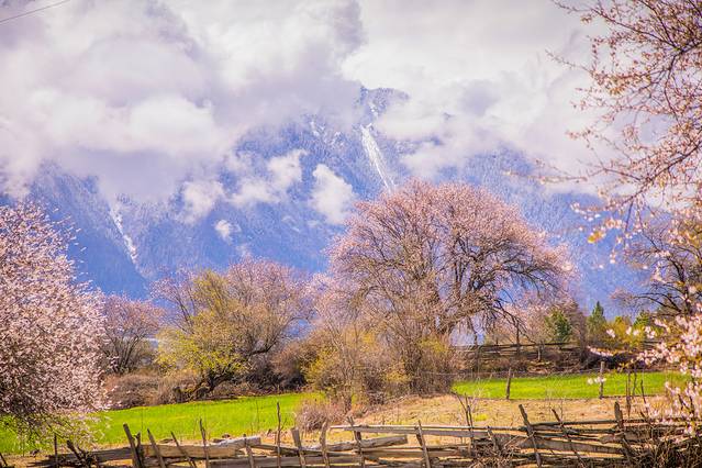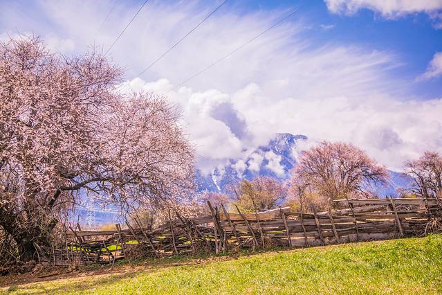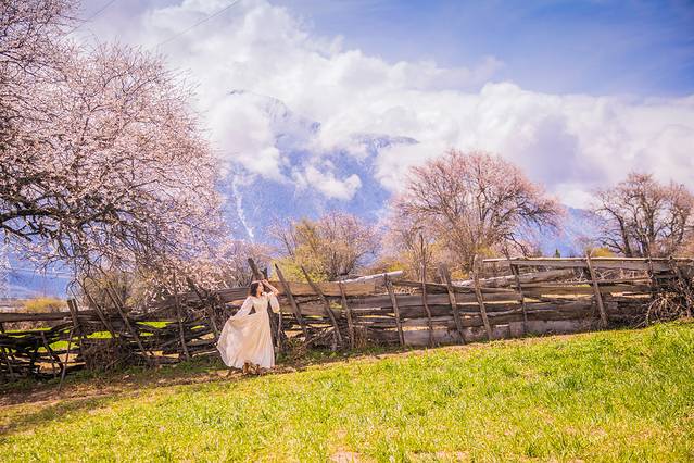 桃花沟两旁都是当地人的领地,看上哪片都可以花5-10元进去逛逛,我们选了一片看起来还不错的小坡,虽然看起来只有十来棵桃花树+绿色的草坡,但是搭配上篱笆和远处的雪山,真的极为出片!一小片地方都能玩一小时。