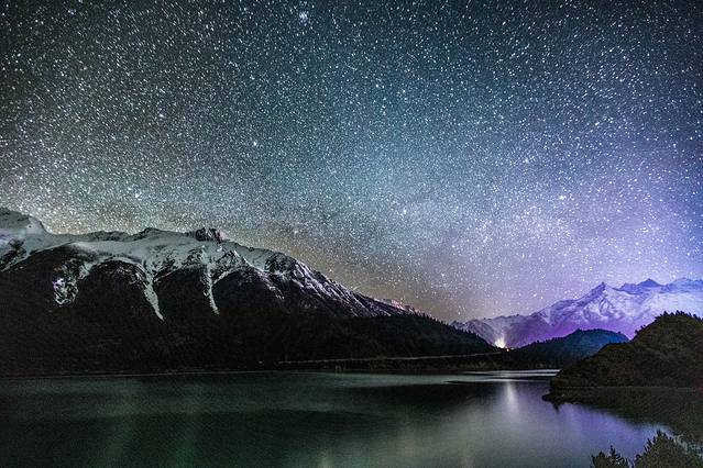 晚上11点天终于黑透了,开着车出去寻找机位。原本在然乌镇附近转,但是发现公路边有很多酒店开着灯,路上也时不时有车,光污染比较严重,拍了几张就转战往上然乌方向。