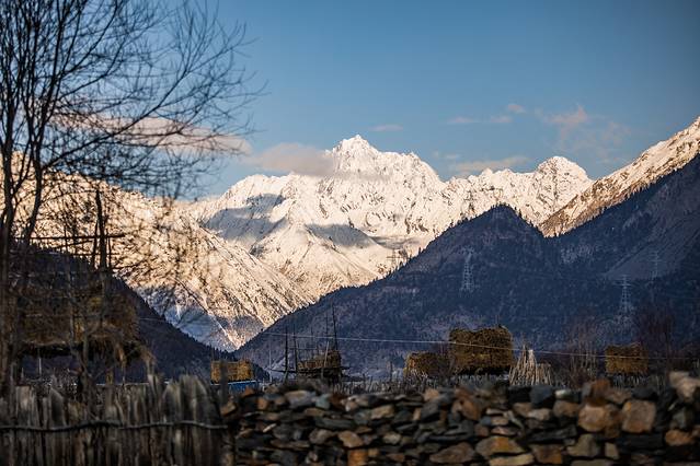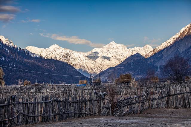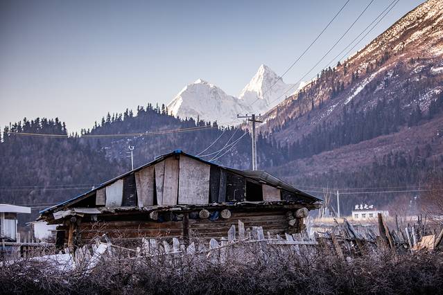 在然乌镇的清晨醒来,太阳照亮雪山尖尖,木屋的炊烟升起。