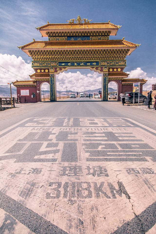 理塘的东城门和西城门都是网红打卡地,地上印着此生必驾318,飞无人机或正面拍照都很好看,但是一定要注意安全。