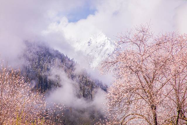 车开出林芝城外,不远的山上应该是下了一夜的雪,整个山头都是白的,云雾缭绕着,仿佛仙境。司机说今天一定能看到超美的桃花,果然桃花在雾气中简直是美爆了。