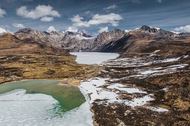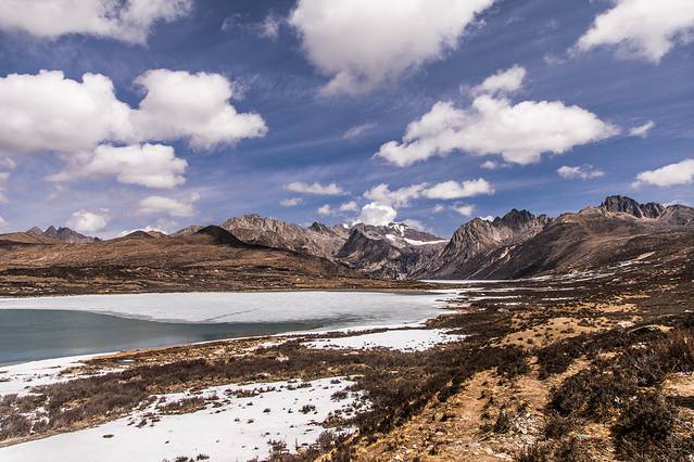 湖畔西南有岗日嘎布雪山,南有阿扎贡拉冰川,东北方向有伯舒拉岭。
