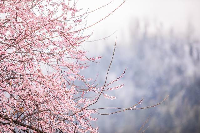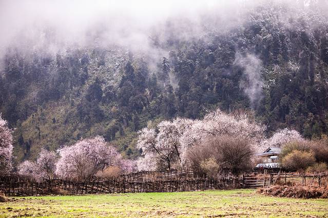 即使花掉了一半,波密的桃花依然非常惊艳,在清晨的云雾中亭亭玉立。