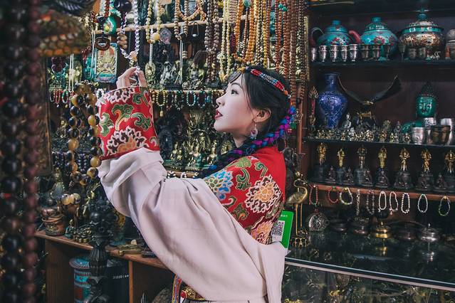 临街的店铺里有着经营大小各异的转经筒、藏袍、藏刀、宗教器具和古老的艺术品店。