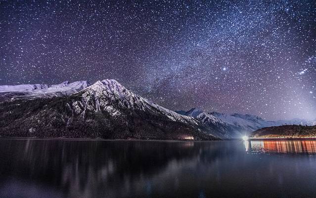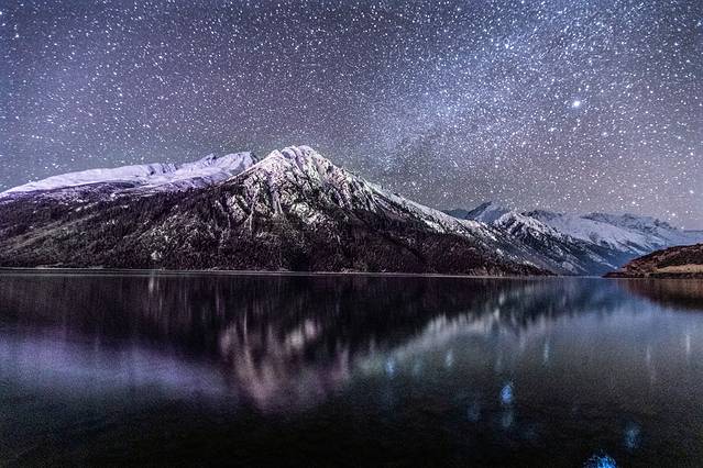 但即使这样,平静的湖面倒影着雪山和星空,依然是美绝了。