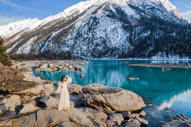 这个时候然乌湖的水质是一年当中最清澈、最唯美、最平静的时段,湖面平静碧绿、雪山湖泊交映生辉,湖面的倒影和林海雪原真是绝美。