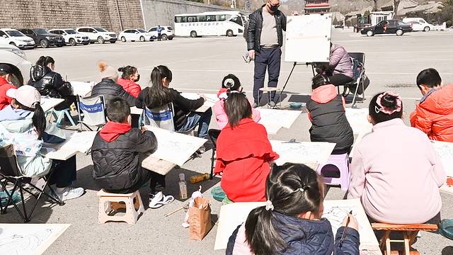 长城下面一群小朋友在学习绘画,画的还挺像那么回事的。