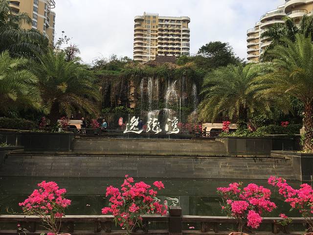 逸龙湾小区本身就处在绿色、鲜花丛中,向着海边的方向走,道路两边的藤蔓成为标准的遮阴棚,每个路口都有标志性低矮的花丛和绿树,不远处可见成排高高的椰子树,走近原来已到海边,椰子树下依稀可见的海沙,仿佛告诉人们,海水可以到达这里,