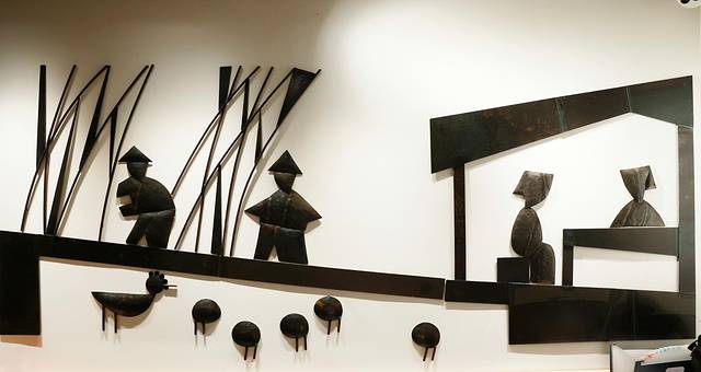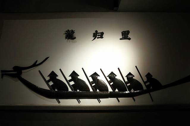 这是民宿大堂里的一幅立体壁画,黑色的浮雕白墙底,展示了生动的划龙舟景象。