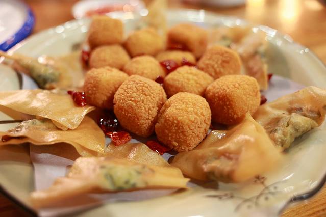 金砖豆腐拼韭菜饼,油炸的方块豆腐,外壳酥脆,内心还是滚烫的豆腐,颜值高,味道好 一块又一块,不亦乐乎,当甜品也好,当主食也行。小小的油炸韭菜饼,趁热非常有滋味。