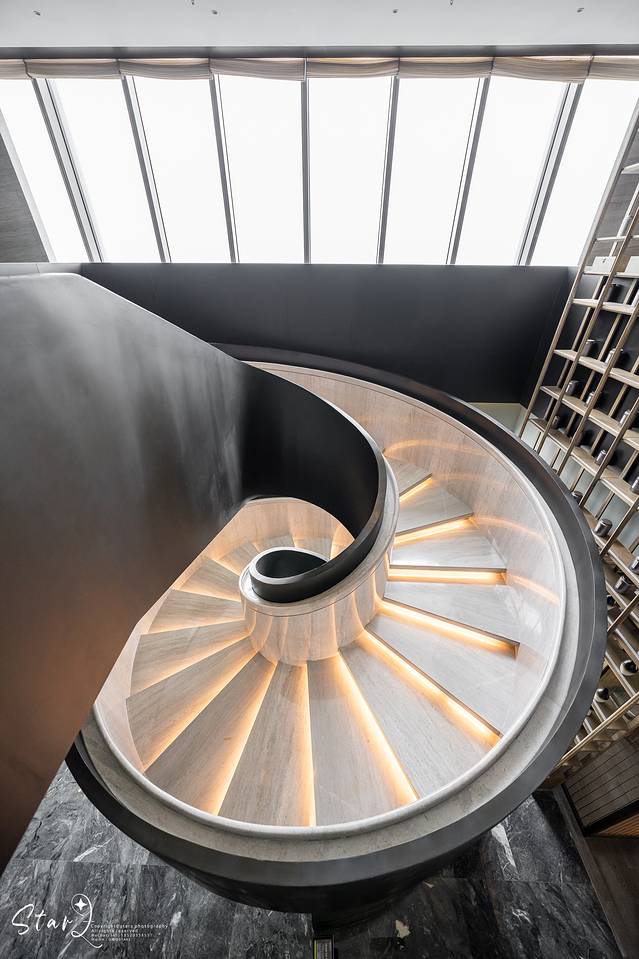 39楼连接40楼的位置有一个酒店网红点——旋转楼梯。它的设计十分有意思,内侧是石材,外侧是金属表皮,象征了灯具从古老时期用石器作为灯体到如今用金属作为灯体的巨大变化。同时也是美女们拍照的绝佳打卡点。