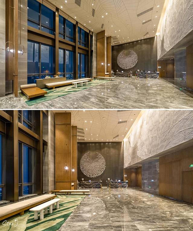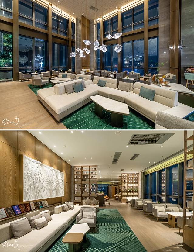 来到位于酒店39楼的「空中大堂」,落地窗的设计,让视野更加开阔,透过玻璃能够鸟瞰中山城市景色和珠江西岸美景,据说若天气晴朗还能够眺望远处广州的小蛮腰。酒店大堂妆点着水滴形灯饰,满满的艺术氛围,让每一位客人都能感受到世界灯都的文化和魅力所在。