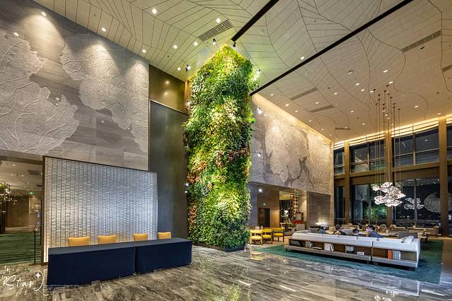 位于大堂一侧,有一处被布满了绿植的地方,是空中大堂的垂直花园。由上至下,仿佛像在云端上延伸而下,完美体现了人与自然和谐共生的理念。