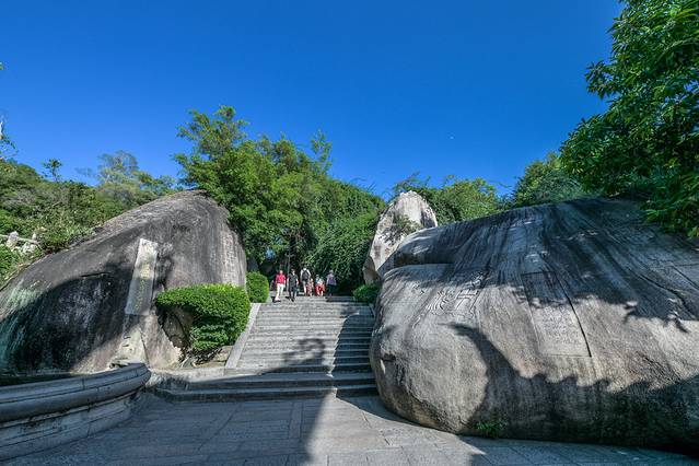 南普陀地处厦门本岛最南端,演武大桥、厦门大学、双子塔等地标均在几百米半径之内。寺院以面朝大海背靠大山的绝佳风水而发展成为福建第一名刹,五老峰就是南普陀寺的靠山与后花园,通过南普陀寺正门进入即可登上抵达五老峰的山顶处。