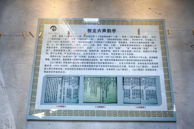 周赟纪念馆大门口的对联题词非常霸气,上面写着“二品教官天下有,六声韵学古来无”,由此可见周赟的六声韵学的贡献是前无古人后无来者的,这样的成就确实能用“划时代”一词来描述。