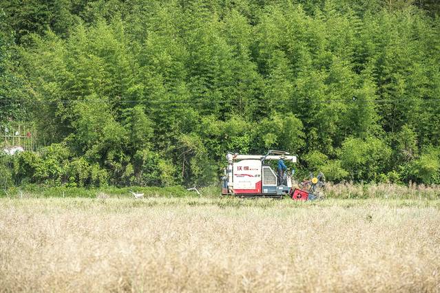 远方的收割机也陆陆续续进入油菜田里了,依稀可见的白鹭与收割机竟如此和谐地处在同一场景,这也太美了吧?如此看来西村里的生态环境相当好,否则这些鸟儿们也不会这么自由地生活在这个村子上了。