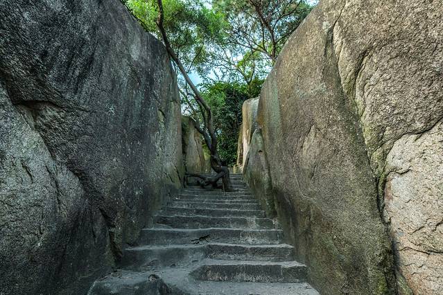在即将通往五老峰最高处的石头缝间有一颗生长在正中间的树,看起来很神奇,当地人都称之为拦路树。到了拦路树的石阶上表示即将抵达五老峰的观景台附近了,再继续往上爬即可抵达厦门岛之巅了。