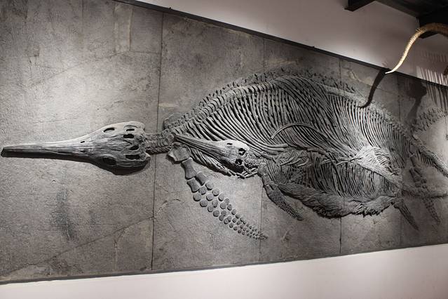 贵州龙是地球上最原始的爬行动物,两栖于滨海环境。属蜥鳍类。生于中生代三叠纪中期,距今已有2.43~2.31亿年。它是一种生活在水中的动物,偶尔在陆地上爬,它们长长的鼻子和大眼晴正好用来在水面上观察四周情况,一旦发现捕食者,它们就用发达的前肢快速找水走,而且凭借发达的肺部,贵州龙可以长时间地潜入水下进行见食或躲迎来犯之敌。贵州龙化石,是20世纪50年代在中国贵州省发现的,故名贵州龙。其特点是颈长探出,头近三角形,眼眶大而圆,四肢细长,前肢比后肢稍粗,爪短,体型酷似现代爬行类的蜥。其体长10-30cm,体虽小却是龙族的祖先。