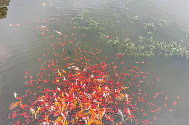 这个湖不算大,但是里面有很多金鱼,还有当地人喂养的鹅鸭,家住附近的人们有时还专门来这里喂鱼。