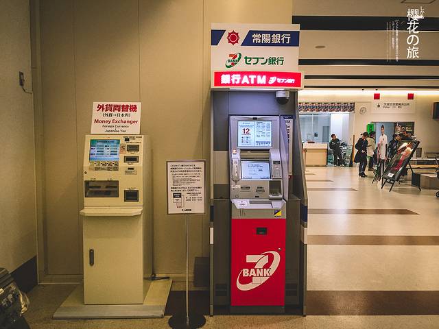 出口就有ATM提款机,一般带7标志的都是支持银联卡的,国内的银联储蓄卡直接插进去取就可以了。