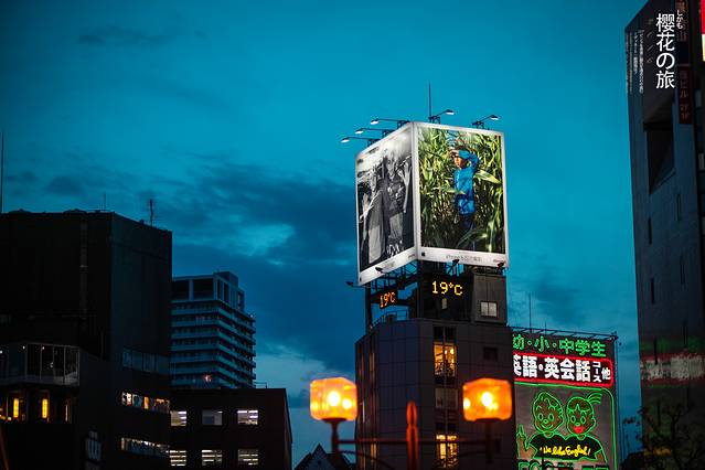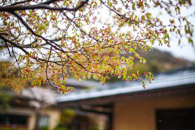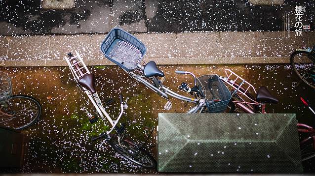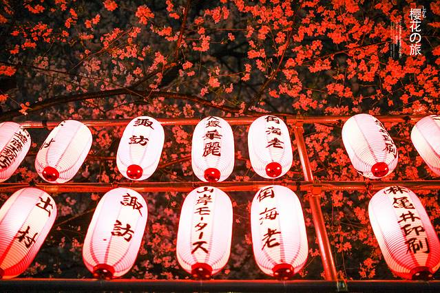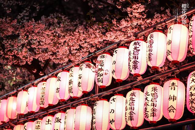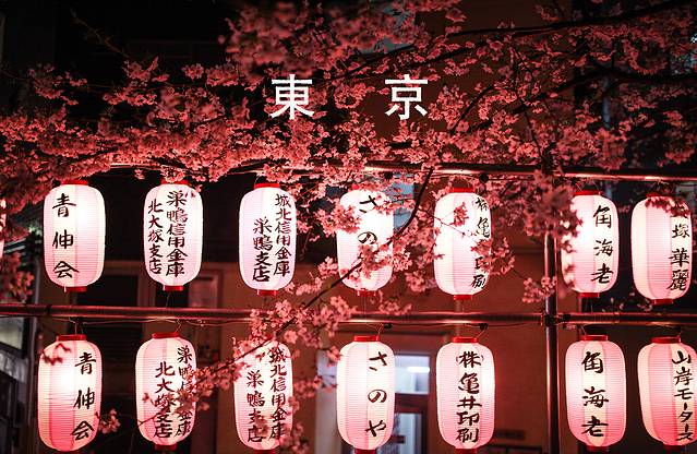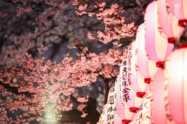 东京下着雨的街头,白色的灯笼映红了粉色的樱花。