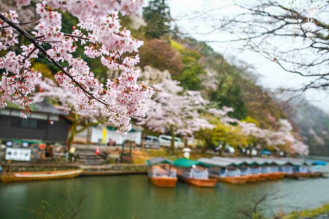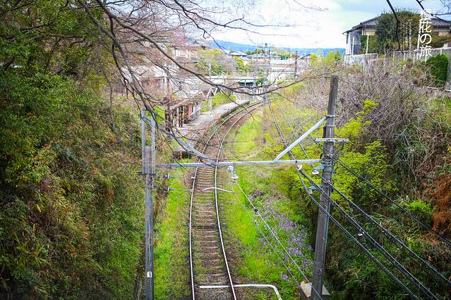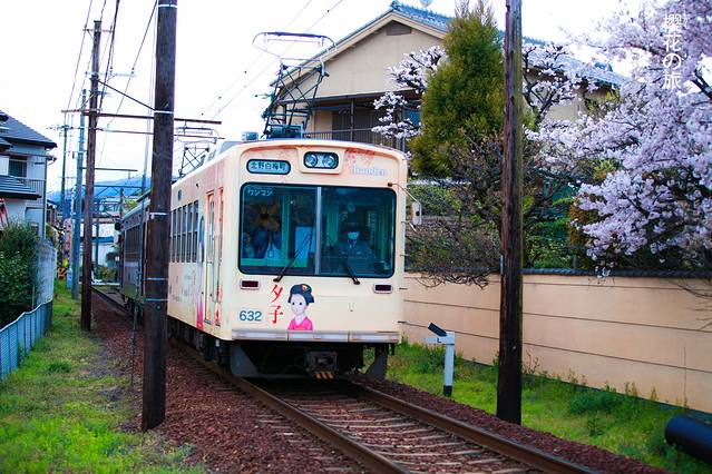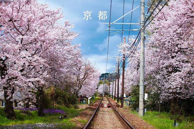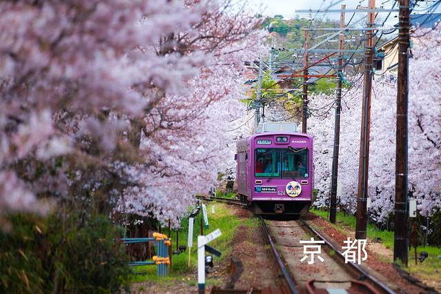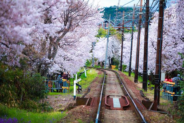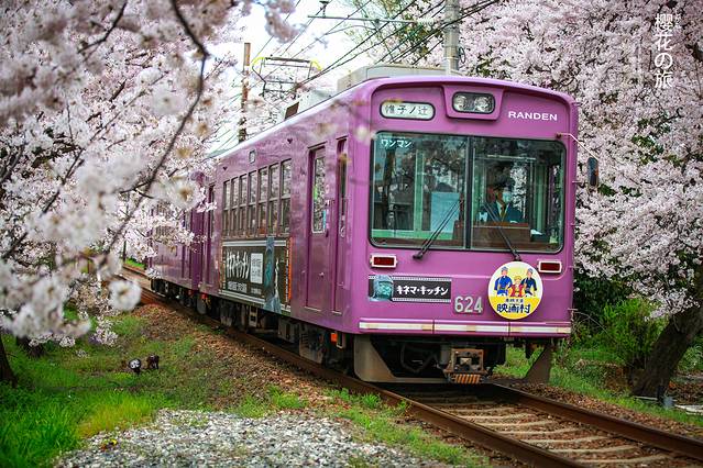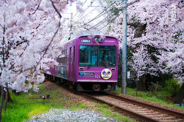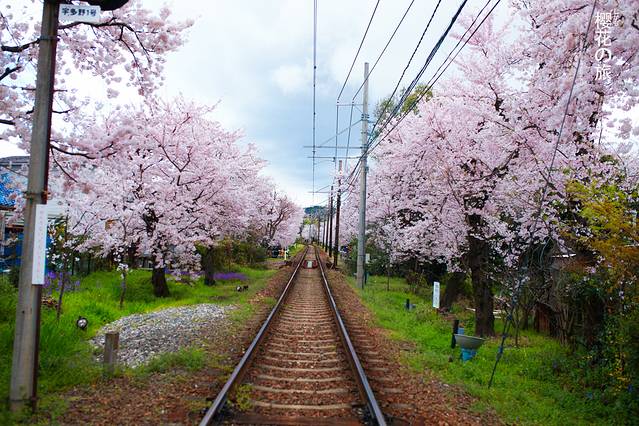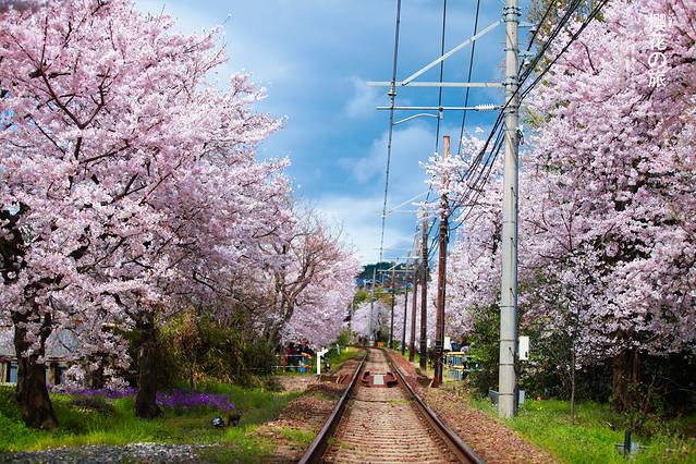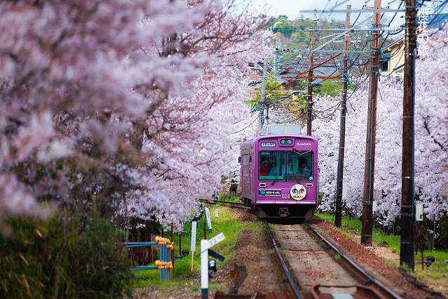 当列车嘟嘟嘟得想起鸣笛声,一辆电车穿梭在铁路樱花隧道里行驶而来,就像许多日本电影里的浪漫场景,春天的列车向你缓缓开来。这里就是岚山电铁北野线从宇多野到鸣淹之间的一段铁路,因为美丽的樱花铁道相衬着一列一列或粉或白或绿的电车的梦幻场景,而吸引了许多旅客。